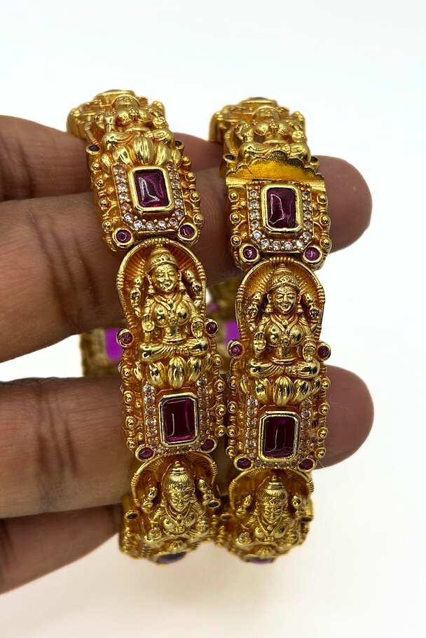 These 925 silver bangles/kada, exquisitely finished with a radiant gold polish, embody timeless elegance. Adorned with vibrant red kemp stones, sparkling white stones, and intricate Lakshmi motifs, they add a regal charm to traditional attire. Perfectly complementing opulent Indian ensembles such as rich salwar kurtas or elegant silk sarees, these bangles make a statement of grace and heritage.