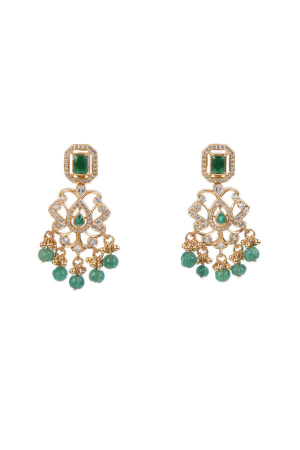 This royal necklace, made with green emerald onyx in a three-layered chain, features an intricately crafted pendant adorned with white zircon, green emerald, white zircon. The necklace comes with matching earrings that echo the design of the necklace. This royal necklace is crafted from 925 silver and gold-plated.