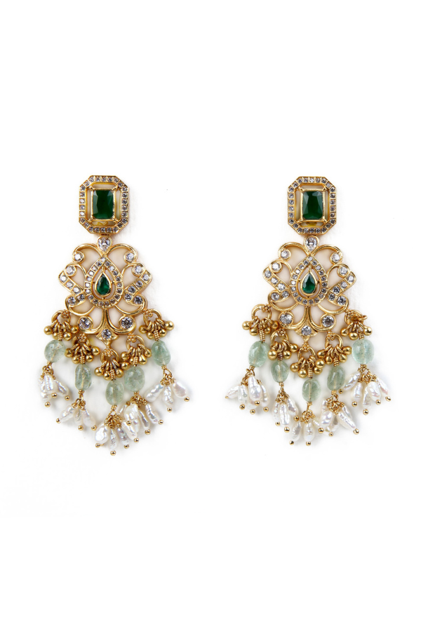 Material: 925 silver (Gold polish), green emerald, white zircon stones, rice pearls, beads.