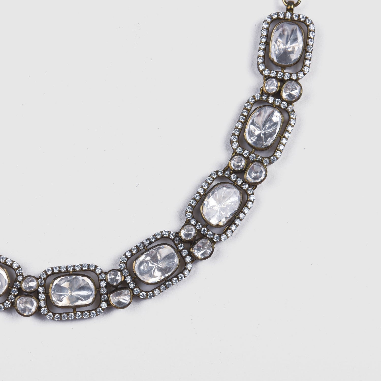This exquisite Moissanite Polki necklace is crafted from 925 silver and elegantly gold-plated, showcasing a regal blend of heritage and sophistication. The design features uncut Moissanite stones arranged in a timeless pattern, radiating a vintage charm. Perfect for weddings and grand celebrations, this piece seamlessly merges traditional craftsmanship with luxurious elegance.