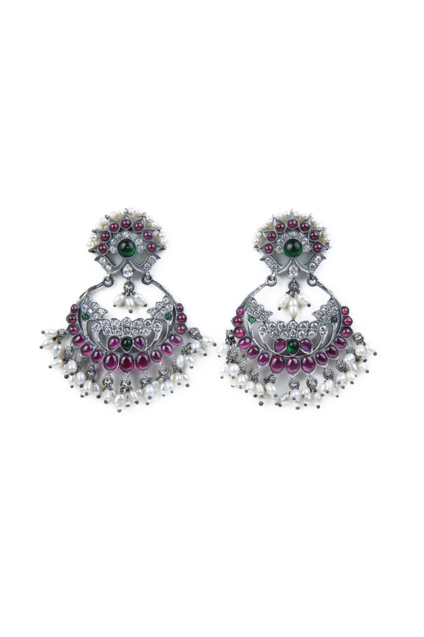 The 925 silver oxidized Rinu chaandbali earring showcases a mesmerizing design with blooming lotus flowers and intricate floral patterns. This complete chandbali earring is adorned with high-quality red kemp, green emerald and sparkling white zircon stones, and it's further enhanced by the addition of dangling pearls.