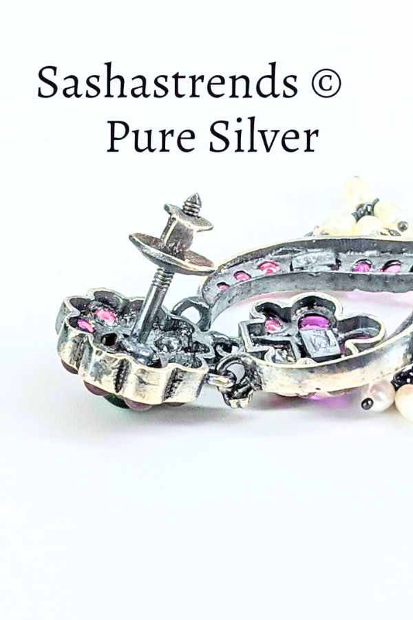 This traditional 925 silver oxidized Sangavi earring is adorned with stunning red kemp and green emerald and pearl hangings. This beautiful earring is a perfect match for both salwar suits and sarees.
