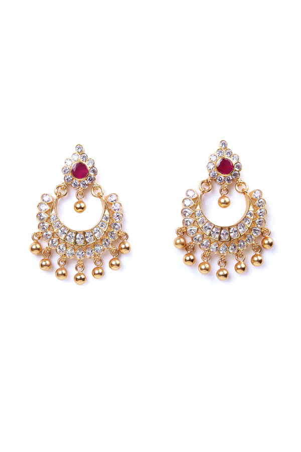 This 925 silver gold polished Avani Chaandbali earring is intricate design and meticulous craftsmanship. It features a distinctive tilak head, with a small ball drop positioned at the center of the Chandbali, drawing attention to its unique charm. Adorned with shimmering white zircon stones and vibrant red kemp, this earring radiates elegance.