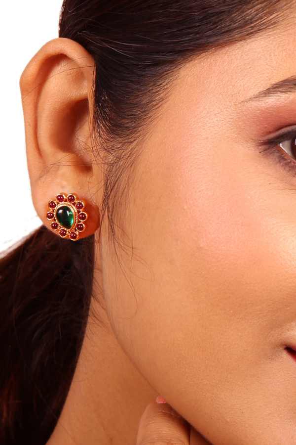 The antique and ethnic-inspired Diti stud is meticulously crafted from 925 silver, boasting a lustrous gold-polished finish. Its exquisite design features intricate drop motifs, adorned with vibrant red kemp and green emerald. This Diti stud effortlessly infuses any attire with a timeless and elegant charm.