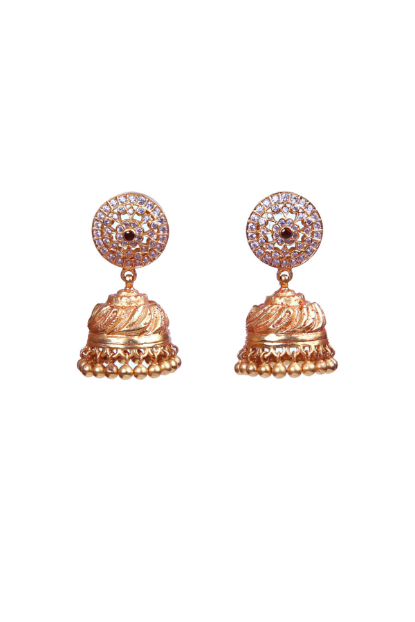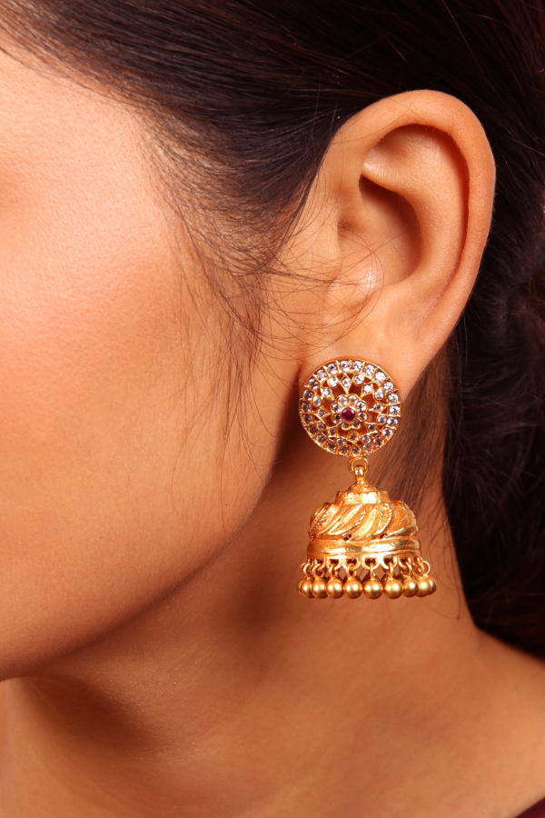 This timeless and classic traditional Kamalika Jhumka exemplifies intricate craftsmanship and detailed design. Its head section displays a round flower design, embellished with the graceful beauty of white zircon stones, and at the center of the motif, vibrant red and green semi-precious stones. Crafted from 925 sterling silver and polished to a lustrous gold finish.