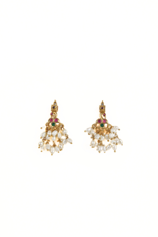 This handcrafted Parnika Guttapusalu necklace, polished with 925 silver and gold, embodies grace and beauty. It boasts intricate flower and peacock designs adorned with red ruby kemp, green emerald kemp, white zircon stones, and pearl dangles, imparting a delightful elegance to the necklace.