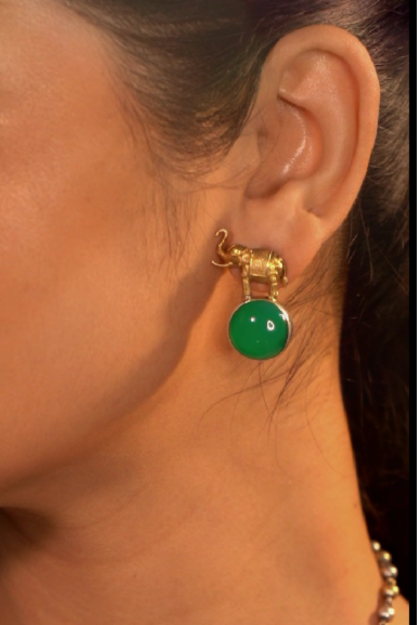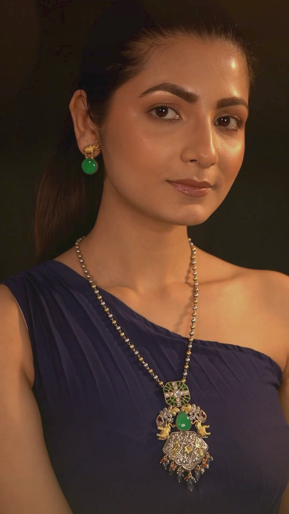This exquisite dual-tone fusion jewelry, crafted from 925 silver, is a true statement piece. Featuring intricate floral designs and animal motifs, it is enhanced with vibrant green stone and blue beads. Paired with matching earrings, this versatile necklace set complements any attire beautifully.