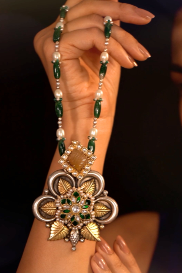This exquisite 925 silver jewelry set features a stunning dual-tone pendant necklace and matching earrings. The necklace showcases flower and leaf motifs, enhanced by vibrant red, green and white stones. The chain is accented with green and pearl beads, adding a pop of color and elegance. The matching earrings mirror leaf design, creating a cohesive and luxurious look. Perfect for special occasions, this jewelry set exudes sophistication and traditional charm.