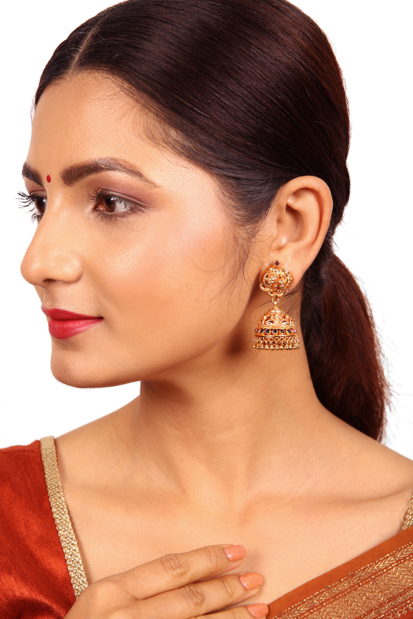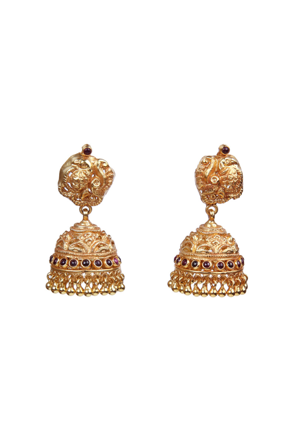This classic Kamalam jhumka elegantly displays the South Indian peacock motif and a round Jhumki with graceful ball dangles and adorned with red kemp, all expertly fashioned from 925 sterling silver and finished with a sophisticated gold polish.