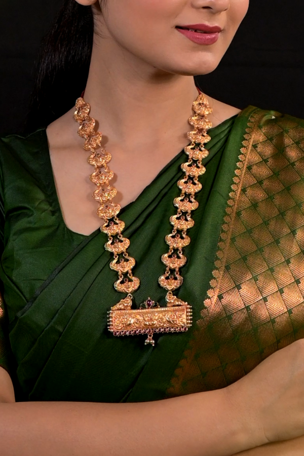 This traditional jewelry set features a rich and intricate design crafted in 925 silver gold-tone. The necklace showcases a wide rectangular pendant adorned with exquisite engravings of peacocks and Simhamura motifs, adorned with small ruby and green stones. The chain comprises a repeating pattern of intricate Simhamura links. The set is complemented by matching earrings. This set is ideal for special occasions and traditional attire, radiating timeless elegance and craftsmanship.