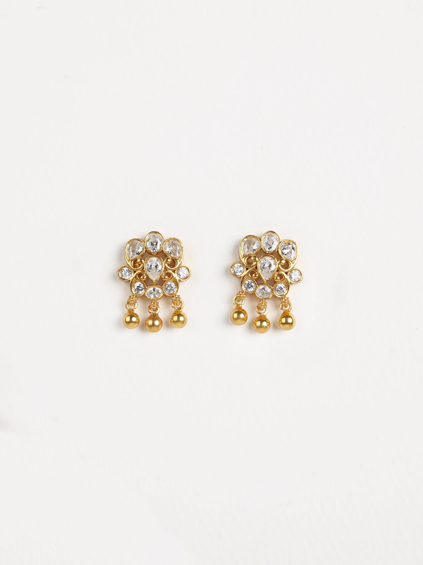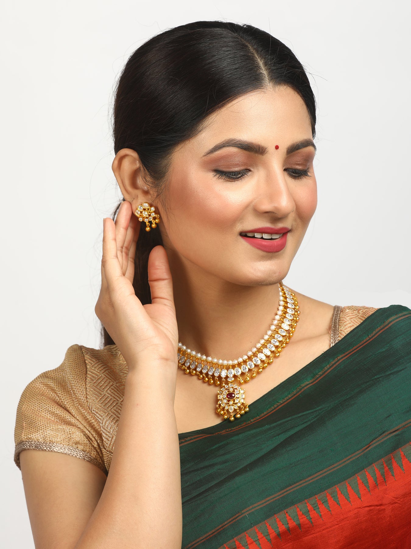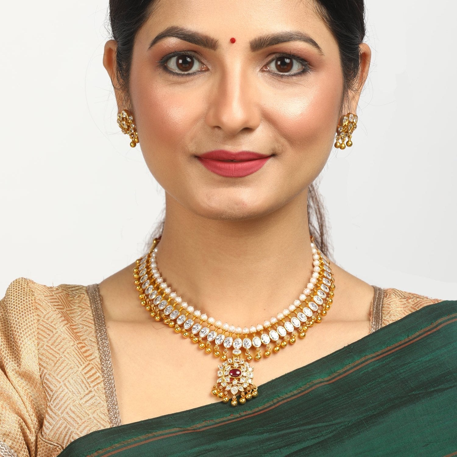 This Parvi necklace, artfully crafted from 925 silver and gracefully polished in gold, showcases a delightful combination of intricate floral designs, adorned with glistening white zircon and vibrant red kemp stones. The addition of ball dangles and pearl arrangements enhances the necklace's charm. Completing the ensemble, the Parvi necklace comes with matching earrings that beautifully mirror the necklace's design.