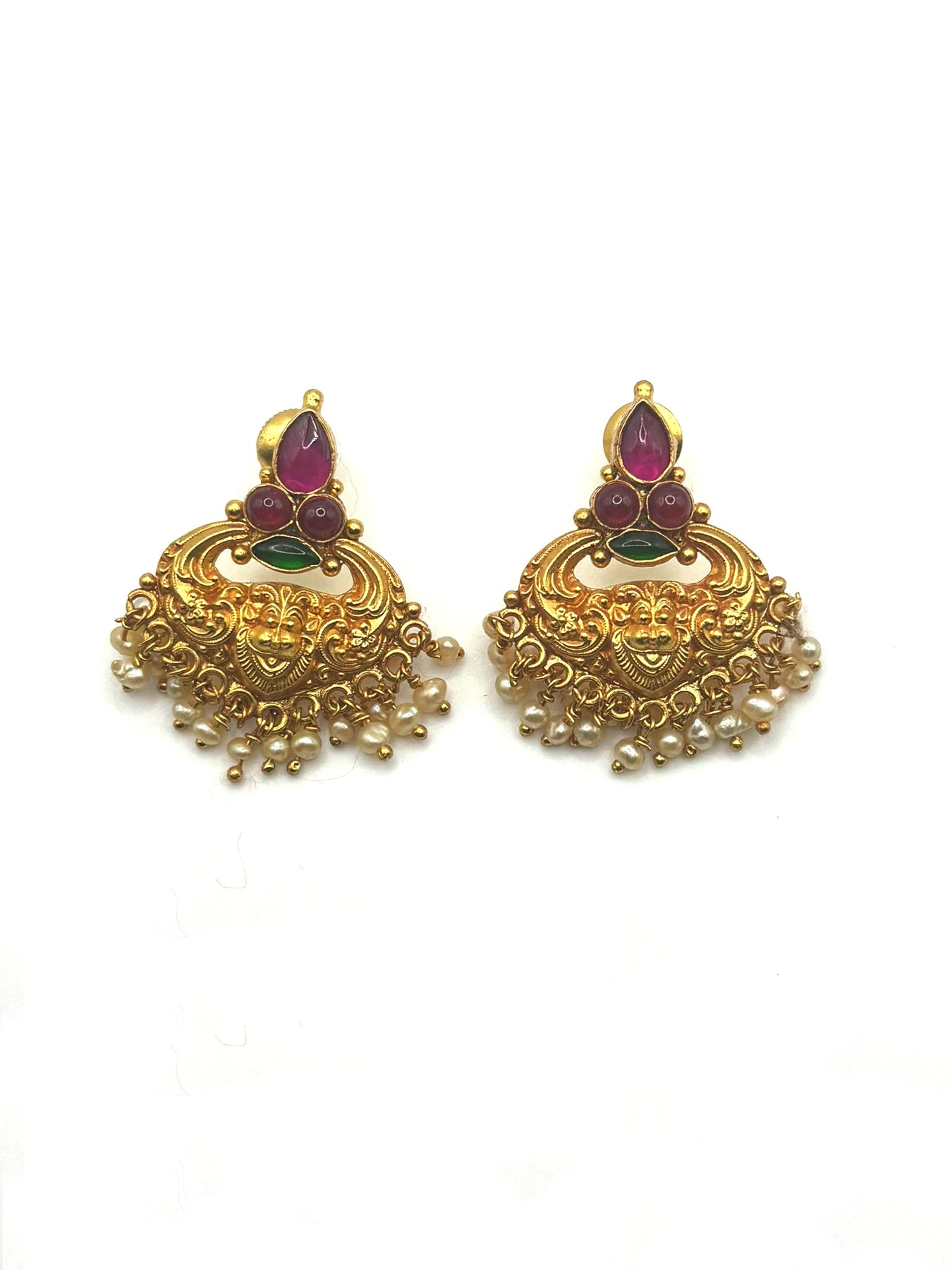 This exquisite necklace intricately crafted from 925 silver and gold plated. The pendant showcases Rama Pattabhishekam motifs design, symbolizing divinity with ruby and green kemp stones and delicate pearl dangles. The pendant strung with a series of lustrous pearls chain. The Necklace is paired with matching earring. This set is ideal for special occasions and traditional attire, radiating timeless elegance and craftsmanship.