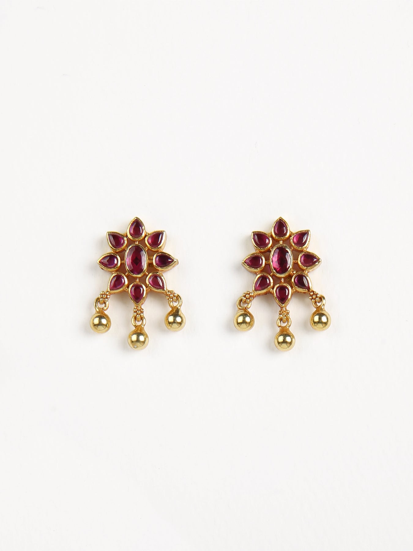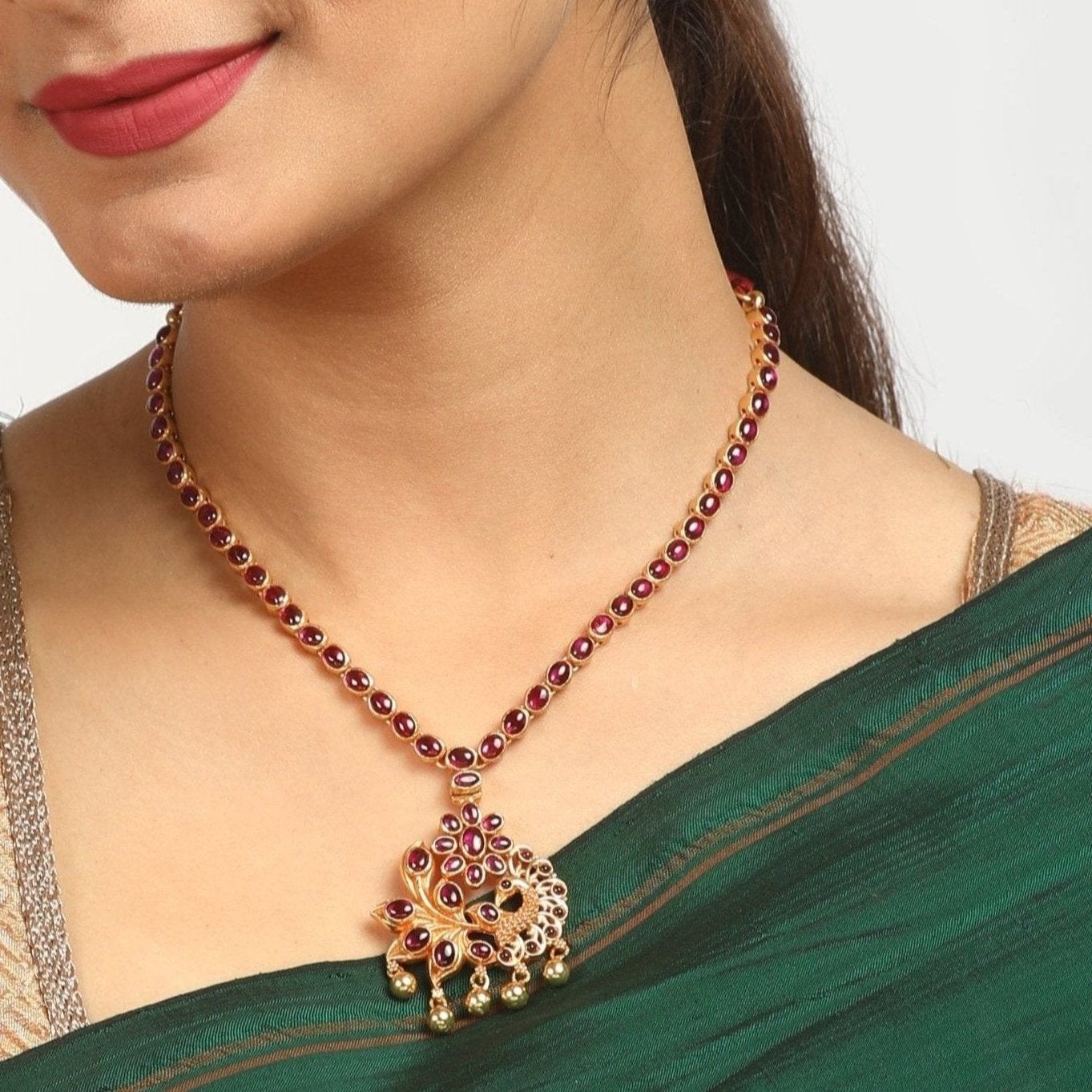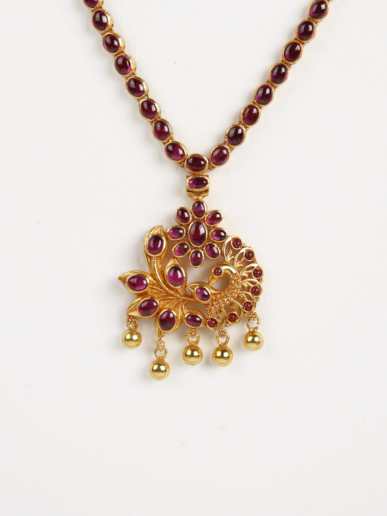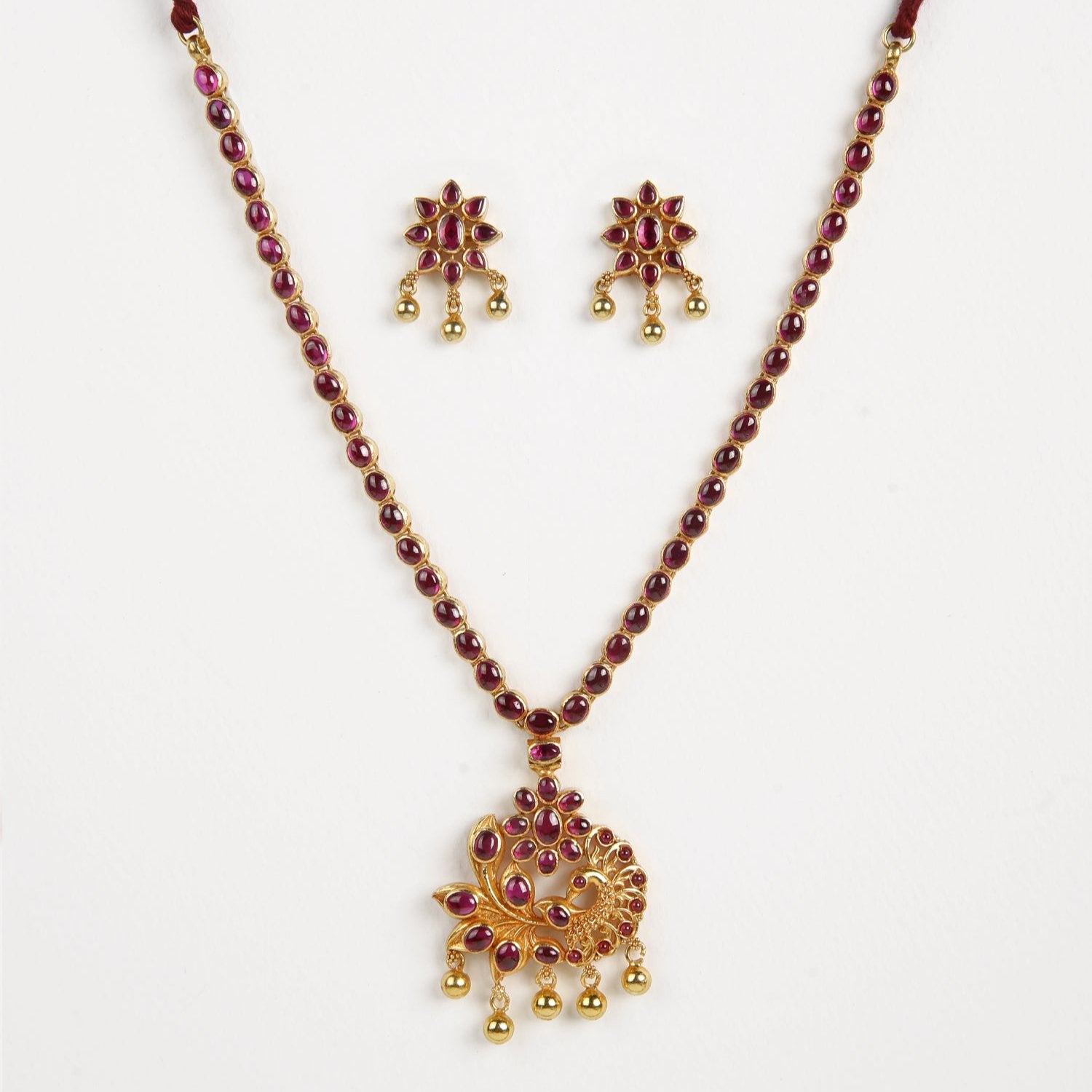 The Sunanda necklace, exquisitely crafted from 925 silver with an polished gold finish, showcases intricate artistry. Its design includes a round flower motif with a peacock motif, and the entire set is adorned with red ruby semi-precious stones, while the charming ball dangles enhance the necklace's overall charm. Completing this elegant set are matching earrings that beautifully mirror the necklace's design.