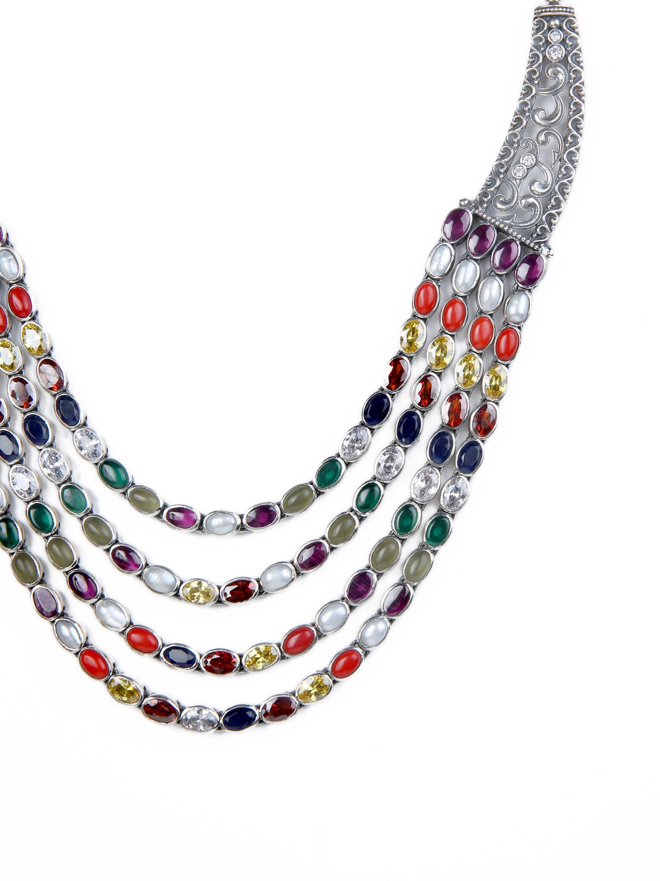 This Ajitha Navarathna Necklace four-layer royal necklace, meticulously crafted from 925 silver oxidized and adorned with dazzling finest Navarathna gemstones, boasts a captivating antique floral pattern that exudes both elegance and modern chic. Paired with matching earrings featuring a charming round pattern design and Navarathna drops, this set radiates sheer fabulousness.