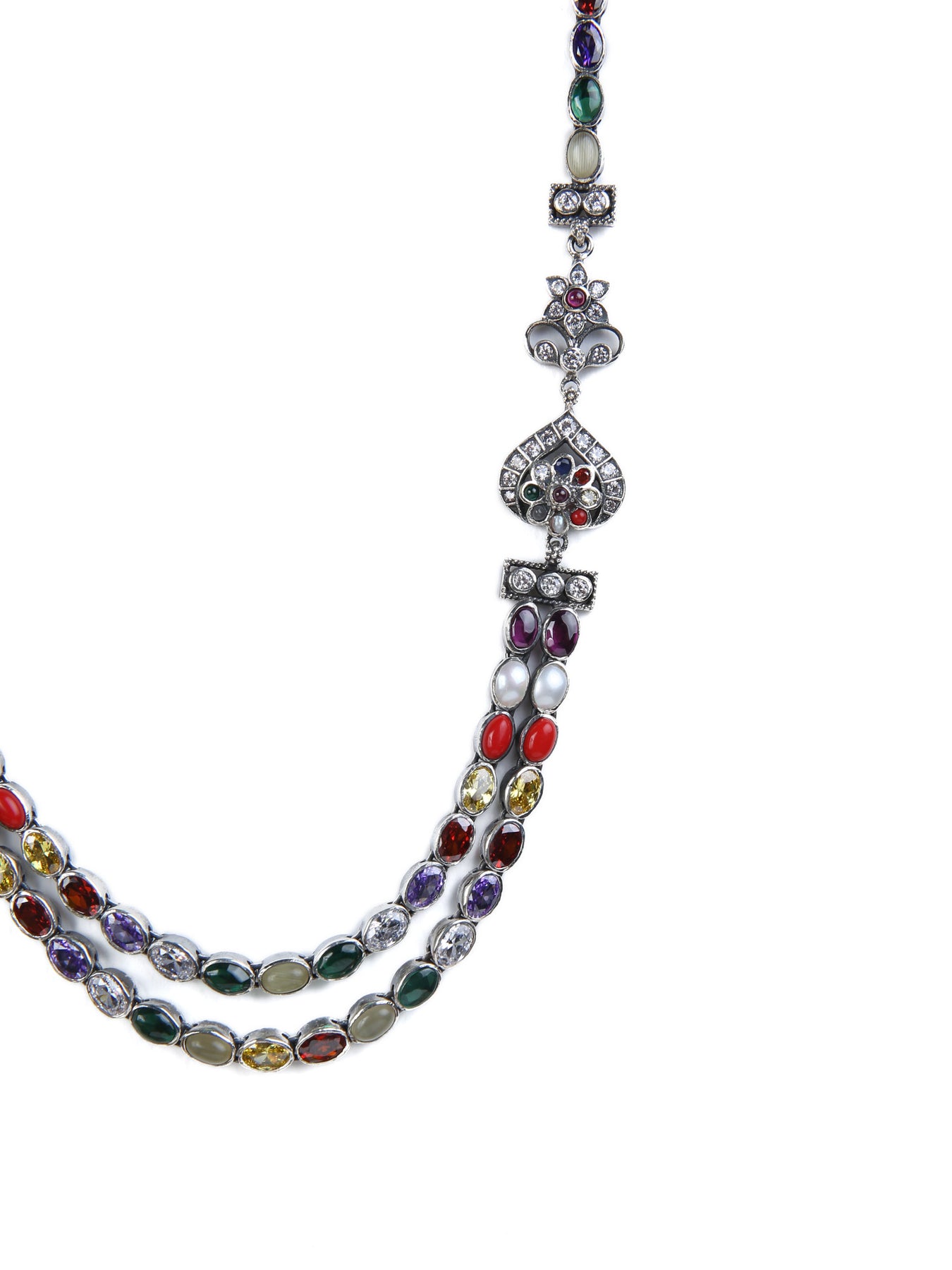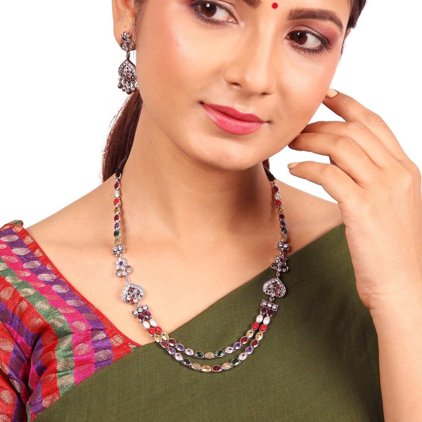 This royal layer Gopika necklace, crafted from 925 silver, boasts a regal design with flower motifs and two layers of chains adorned with Navarathna gemstones, creating a stunning and intricate piece. The matching earrings mirror the same motifs as the necklace, making this complete royal necklace a standout and special addition to any collection.