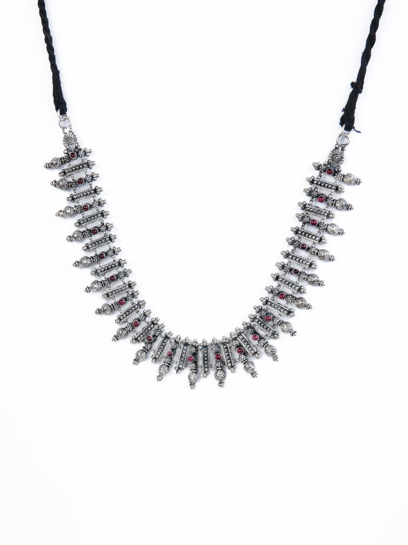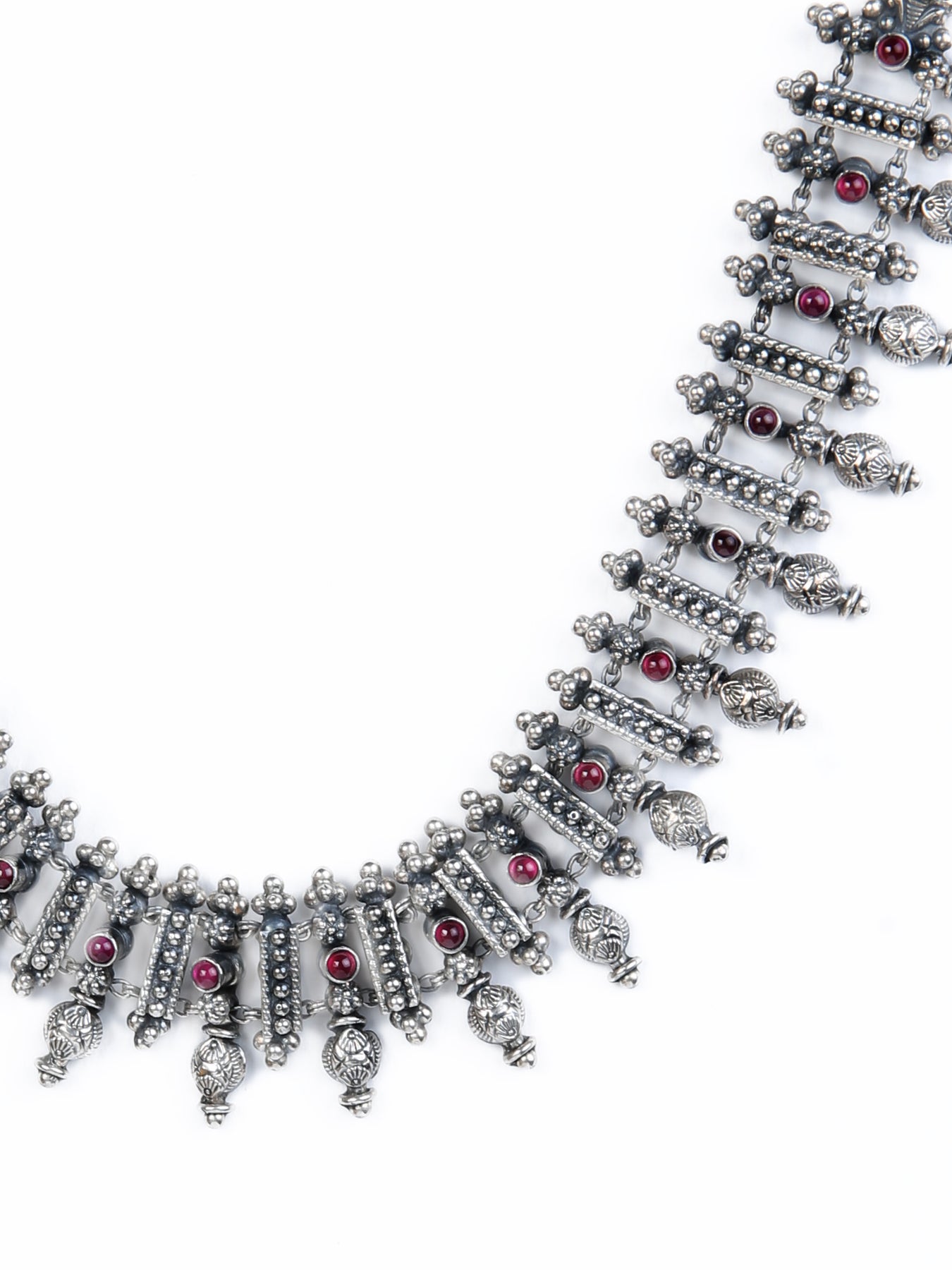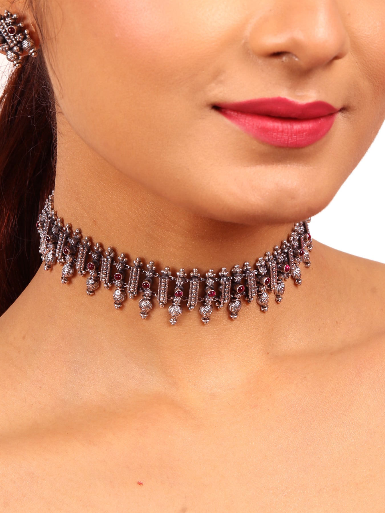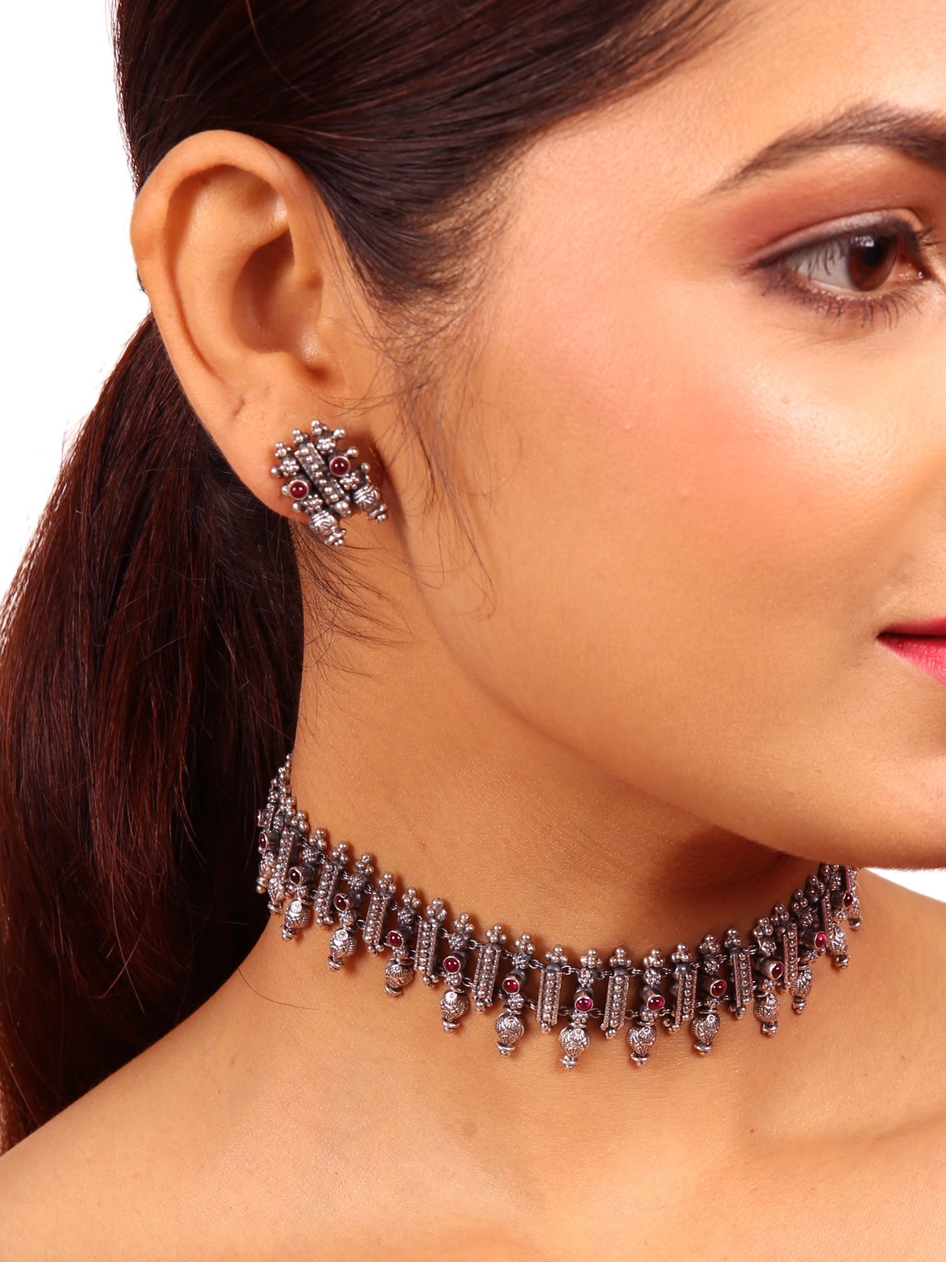 This belt-style Indira necklace is a true antique beauty, meticulously handcrafted from 925 silver with an oxidized finish. Its exquisite detailing and the enchanting red Kemp stones carefully studded throughout make this choker irresistibly eye-catching. To complete the ensemble, it is thoughtfully paired with matching stud earrings.