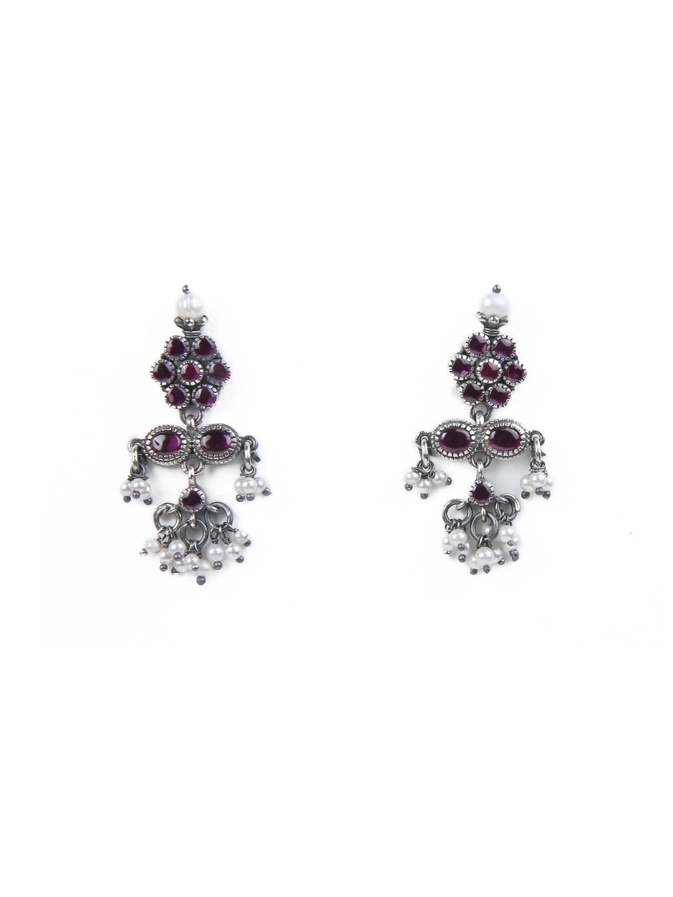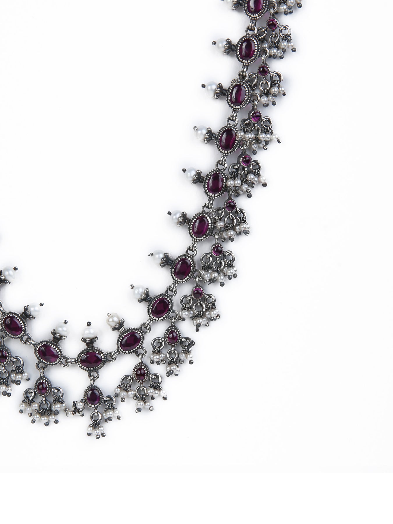 This meticulously handcrafted Jiya Necklace in oxidized 925 silver showcases a traditional pattern adorned with exquisite red (spinal ruby) stones, along with elegant pearl dangles that elevate the necklace to a top-notch piece. The necklace is beautifully paired with matching earrings featuring the same exquisite design.