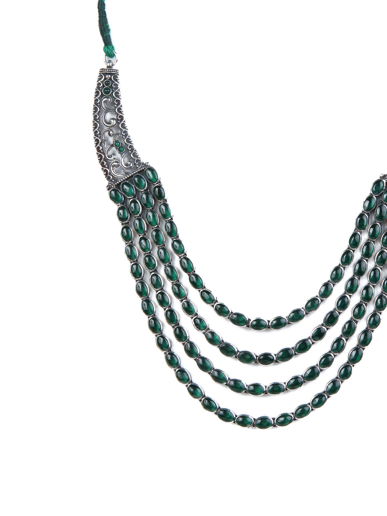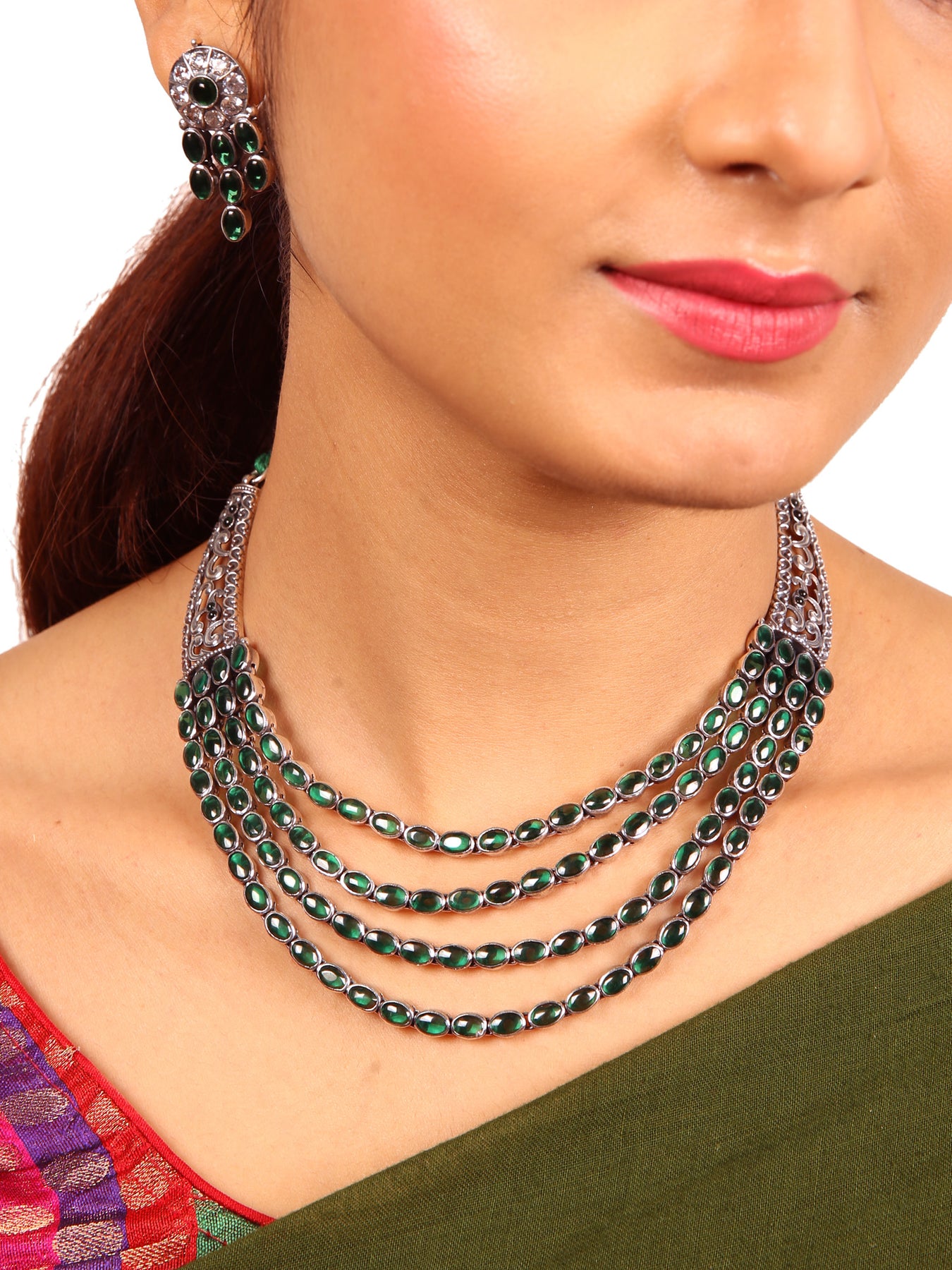 This regal Bhavani necklace is meticulously crafted from 925 silver, adorned with an exquisite oxidized finish. The necklace showcases a royal design with four layers, each adorned with stunning green emerald stone. These layers are gracefully clustered with a captivating floral pattern clutch. To complement this royal necklace, there is a matching earring featuring white zircon stones and green emerald.