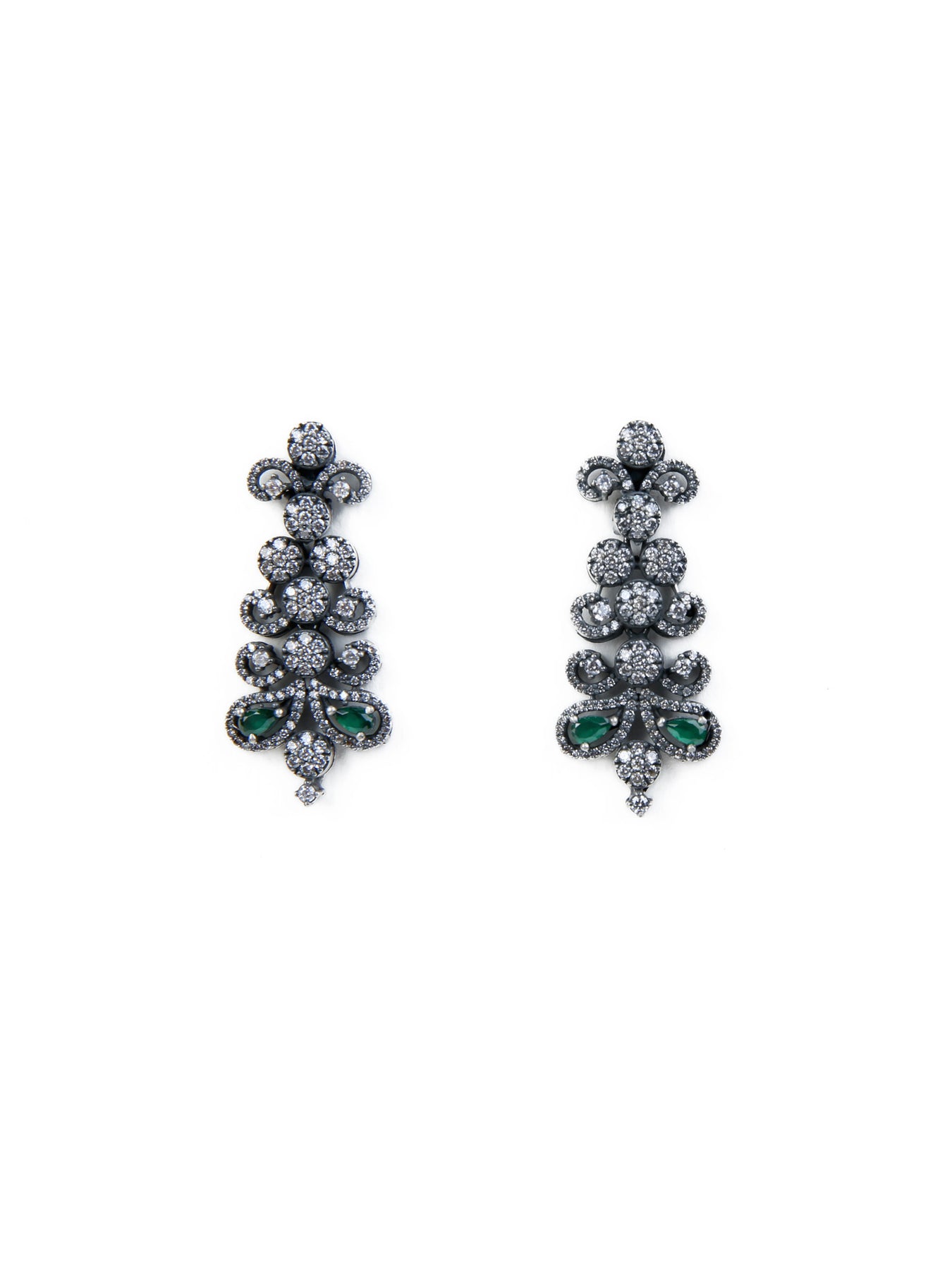 This 925 silver in oxidized finish, Mridula necklace is a splendid creation, featuring drop-shaped and flower-designed patterns with a minimalistic touch. It is elegantly adorned with green emerald and white zircon, exuding an aura of regal charm. The necklace is complemented by a pair of graceful matching earrings that echo the necklace's exquisite design.