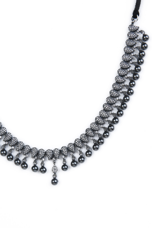 This 925 oxidized Tara antique necklace showcases an exquisite mango design, meticulously crafted and adorned with lustrous white zircon stones. The addition of ball dangles enhances the overall beauty of the set. This necklace is perfectly complemented by matching earrings designed in the same exquisite pattern.