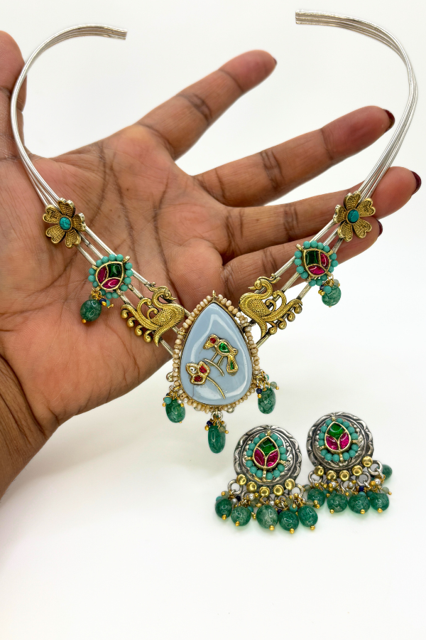 The necklace features a sleek wire base accented with antique gold-finished elements, creating a striking contrast. At the center is a teardrop-shaped pendant with a soft pastel blue stone, intricately detailed with ruby and emerald accents, peacock motifs on either side symbolize protection and strength, adding a heritage touch giving it a graceful, artistic appeal.