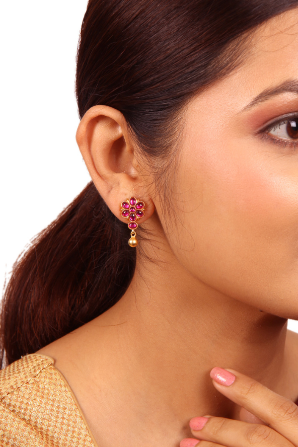 This 925 silver gold-polished Ishi stud earring is a testament to meticulous craftsmanship, featuring intricate detailing and minimalistic flower design. Adorned with red spinal ruby kemp and a generously sized ball dangle, this Ishi stud stands as a timeless addition to any jewelry collection.