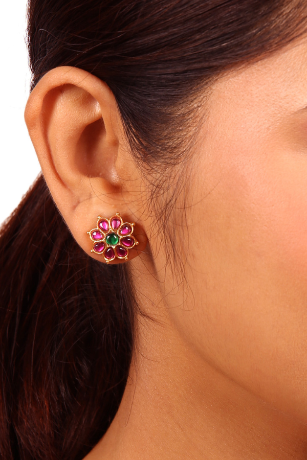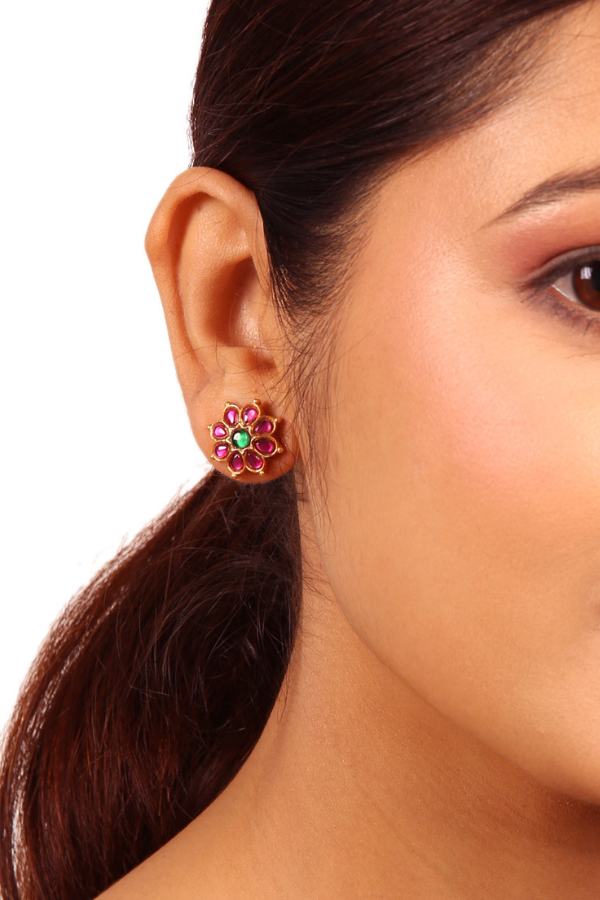 This Savi stud earring, made from 925 silver, is presented with a gold finish and showcases an antique-inspired, understated floral star design enriched with vibrant red spinal ruby kemp and green emerald kemp embellishments. This stud earring is used for daily wear.