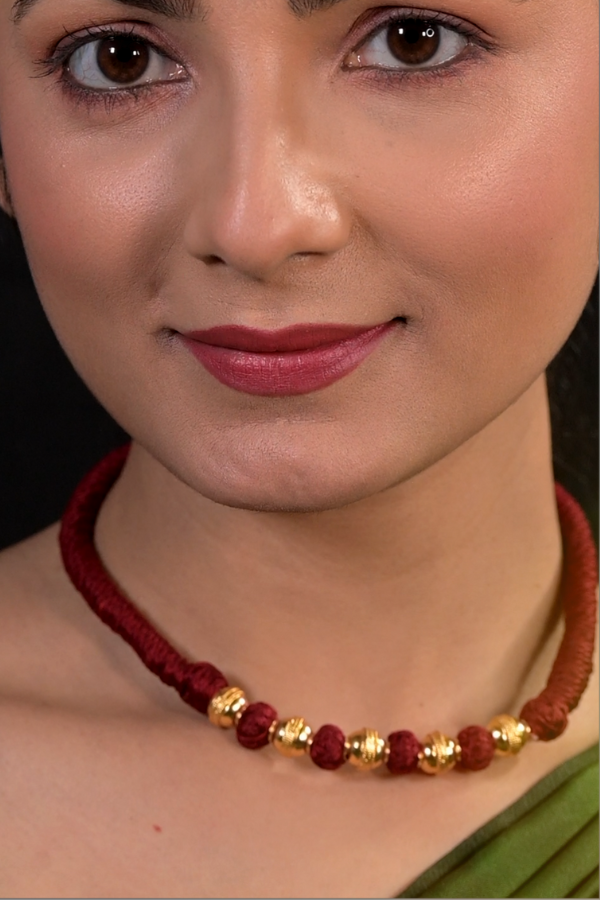 This distinctive necklace features a rich maroon thread cord adorned with intricately designed gold-tone round balls, adding a bold and elegant touch. This making it an ideal accessory for festive occasions or pairing with ethnic outfits.